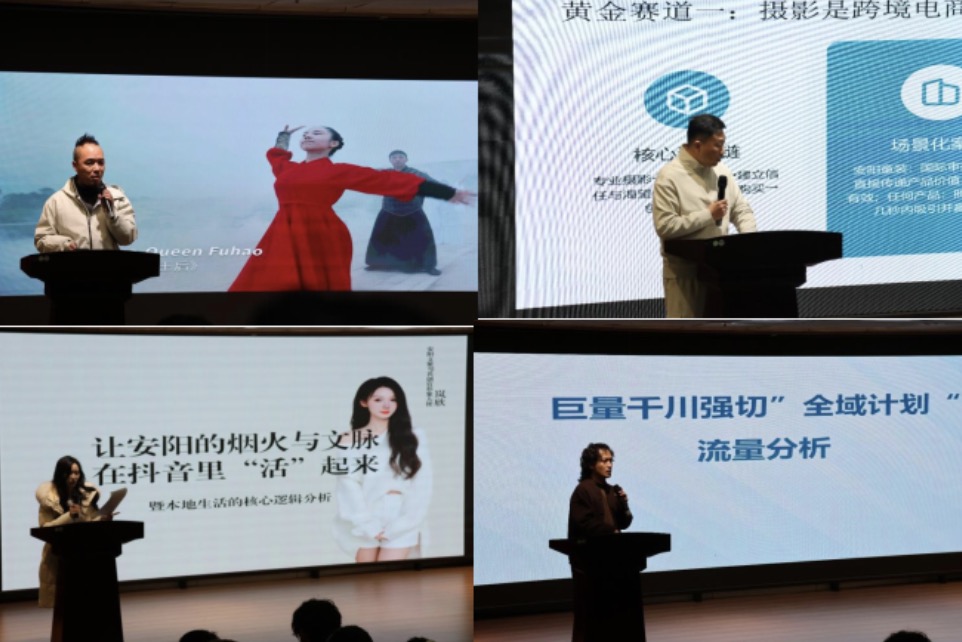活动现场,安阳摄影家协会理事、导演徐强结合安阳和殷墟对外宣传片案例,解析文化短视频创作技巧;跨境电商企业运营总监高海堂以“摄影变现新赛道”为题提供商业化思路;文旅达人岚欣从用户视角解读地方文化传播;临汐信息科技有限公司总经理张子昂针对新媒体流量趋势做主题分享。企业导师的分享既有行业前沿动态,又紧扣安阳文化特色,与高校的理论教学形成互补,为学生构建了“理论+实践”的完整知识体系。